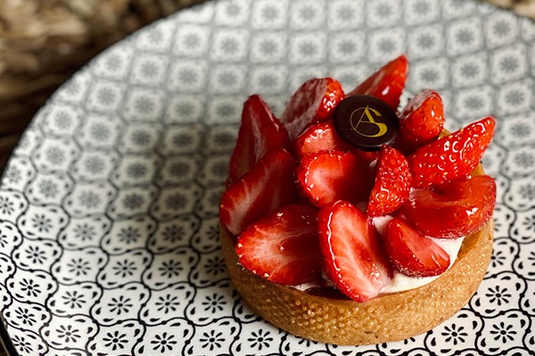Biscuit cake, streuzel noisettes fleur de sel, confit fraises Gariguettes, mousseux à la pâte d’amande et chocolat blanc