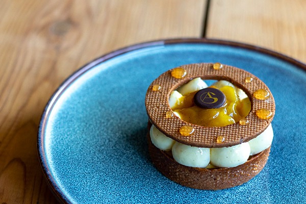 Streuzel noisettes – ganache montée vanille gousse – brunoise pommes Granny Smith au poivre de Sichuan – glaçage végétal